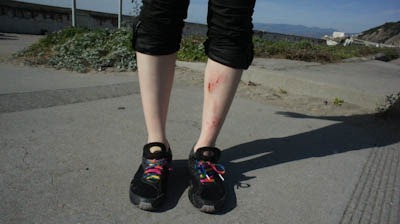 And, just as suddenly as she had fallen into the water earlier, we hit a bump and go flying off the skateboard. She’s in front of me, so I land on her, adding injury to more injury. Now I’m bleeding, too.