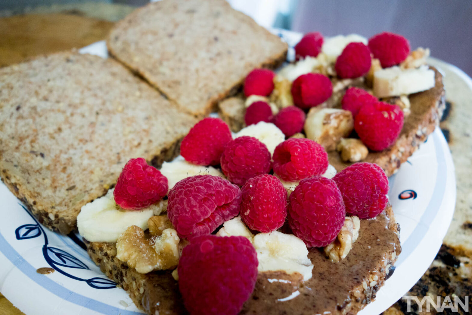 The beginning of my eating period is two pm. I make three open face sandwiches consisting of the following: one piece of ezekiel seed bread, hazelnut almond butter, a small handful of walnuts, one third of a banana, and a lot of chia seeds. Sometimes I have some nice organic berries to put on top.