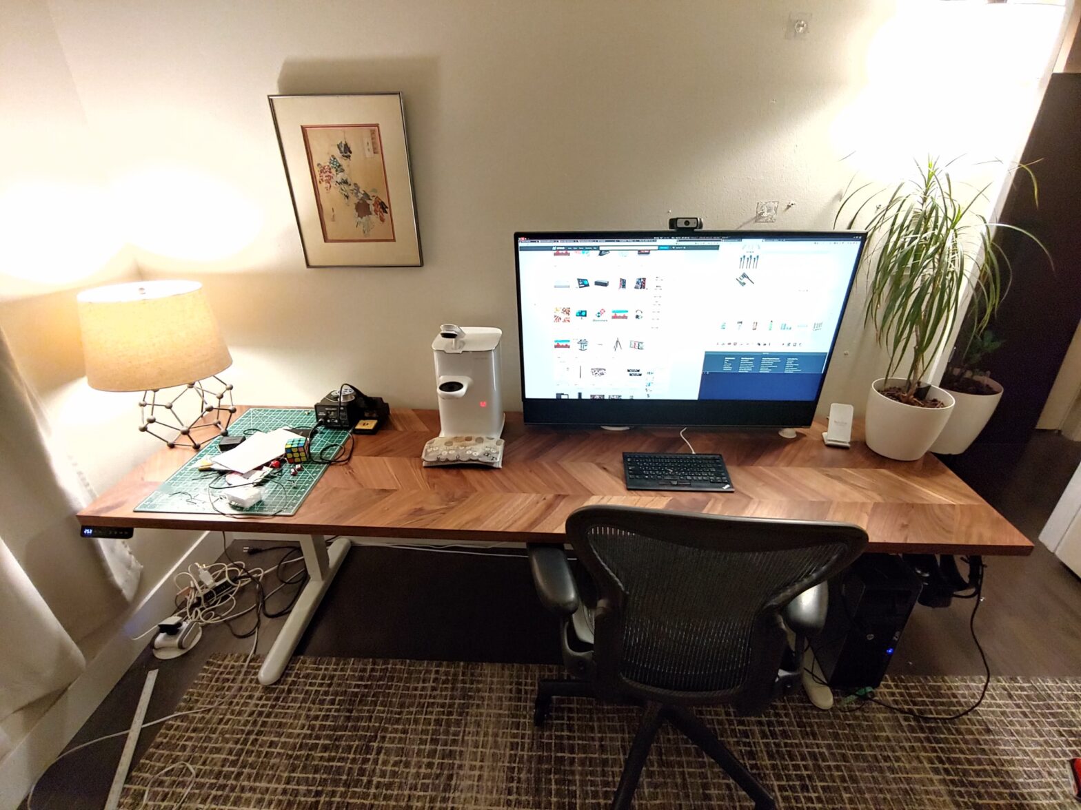 In my office is a huge 98″ desk that I made out of an IKEA countertop. I have a 43″ monitor and the exact same keyboard/trackpoint combo that I use on my laptop. My desktop and laptop sync so that I can work equally well on either, and I use the same keyboard/trackpoint combo so that there’s no friction in moving between them. My computer is a whole other level of friction-reduction, doing a lot of stuff for me, and having key combinations for just about everything else.