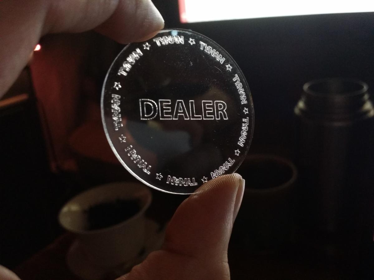 Photo is an awesome portable dealer button that my friends helped me make. It’s cut and engraved with a laser, which is amazing.
